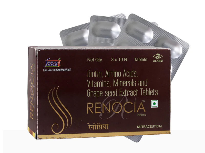 Renocia Tablet is a multivitamin supplement enriched with biotin, amino acids, vitamins, minerals, and natural extracts to strengthen and grow hair. This nourishing formula supports hair growth at the cellular level and revitalizes follicles from within. Suitable for all hair types, it promotes stronger, healthier, and well-nourished hair.