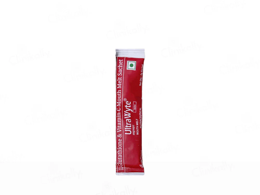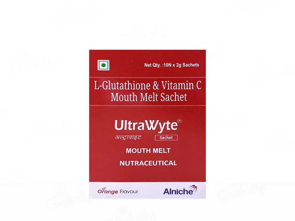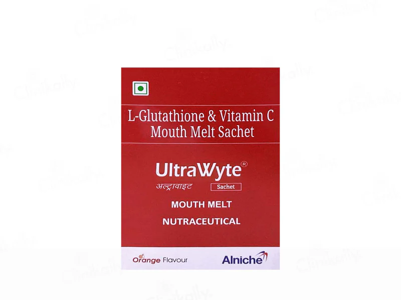 UltraWyte Mouth Melt Sachet (Orange Flavour) is a powerful antioxidant-rich dietary supplement designed to enhance skin health and overall wellness. Each sachet contains 500 mg of L-Glutathione and 65 mg of Vitamin C, helping reduce oxidative stress, brighten the skin, and support detoxification. L-Glutathione aids in lightening pigmentation, while Vitamin C boosts collagen production for improved skin elasticity. The convenient mouth-dissolving formula ensures quick absorption without water, making it ideal for daily use.